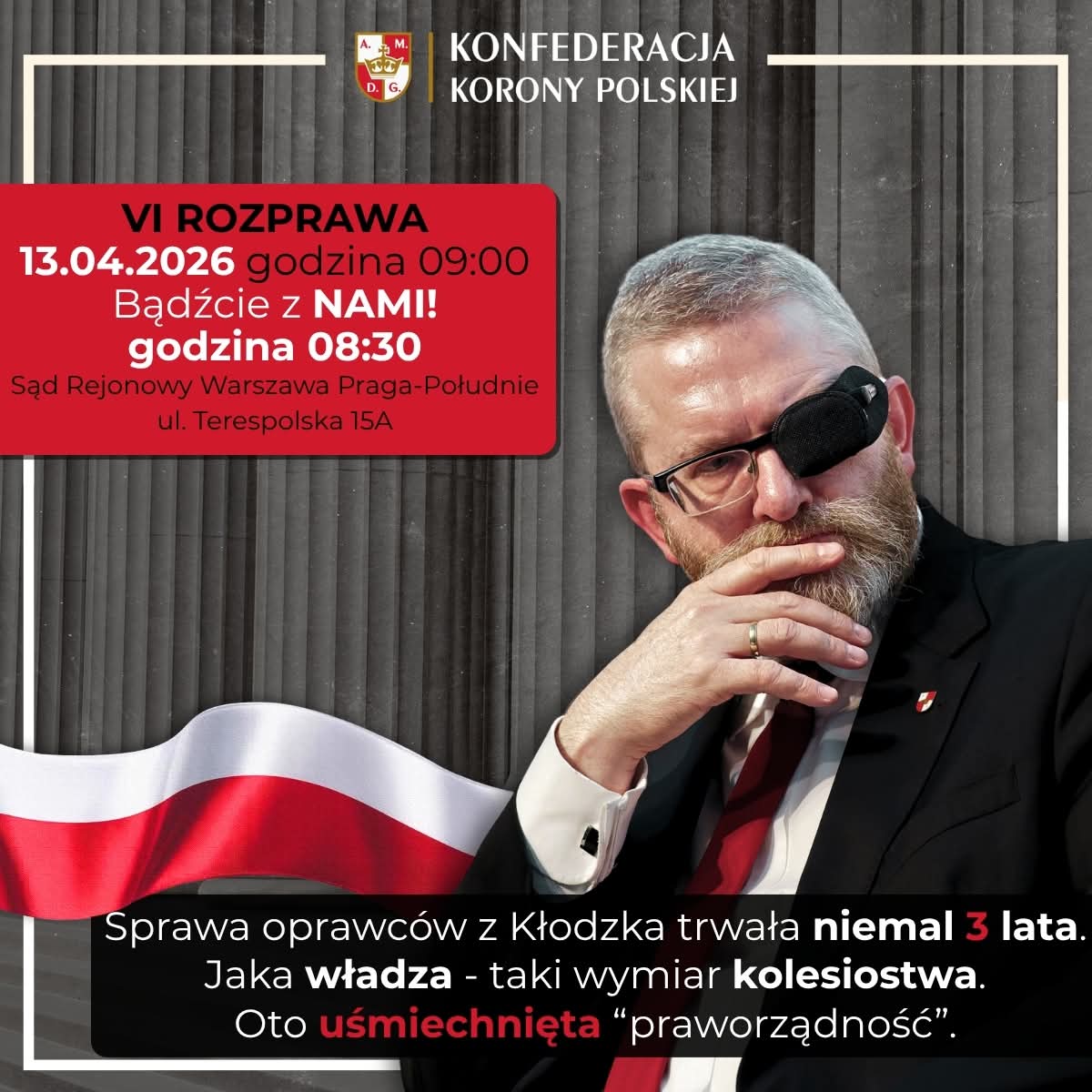 Błyskawiczny proces polityczny naszego Prezesa nie zwalnia. Zrobią wszystko, aby wyeliminować Grzegorz Braun. Kolejna rozprawa już w najbliższy poniedziałek. Będziemy na miejscu! Jak zawsze stajemy #MuremZaGrzegorzemBraunem. Zapraszamy do dołączenia do pikiety wsparcia. 13 kwietnia, poniedziałek, od godz. 8:30, Sąd Rejonowy Warszawa Praga-Południe, ul. Terespolska 15A Dziękujemy w imieniu naszego Prezesa 🇵🇱