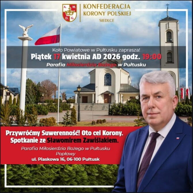 Konfederacja Korony Polskiej Okręgu 18 Koło Powiatowe w Pułtusku zaprasza: w piątek 17 kwietnia AD 2026 o godz.19.00 odbędzie się spotkanie - Przywróćmy Suwerenność! Oto cel KORONY - naszym Gościem będzie Sławomir ZAWIŚLAK Poseł na Sejm Koła Konfederacji KORONY Polskiej. Spotkanie odbędzie się w podziemiach kościoła Parafii Miłosierdzia Bożego w Pułtusku - POPŁAWY, ul. Piaskowa 16. Pozdrawiam Z Panem Bogiem! […]