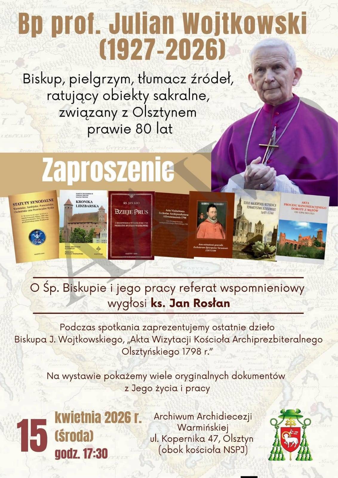Biskup, pielgrzym, tłumacz źródeł, ratujący obiekty sakralne, związany z Olsztynem prawie 80 lat. Bp prof. Julian Wojtkowski (1927-2026) O Śp. Biskupie i jego pracy referat wspomnieniowy Wygłosi: Ks. Jan Rosłan Podczas spotkania zaprezentujemy ostatnie dzieło Biskupa Juliana Wojtkowskiego "Akta Wizytacji Kościoła Archiprezbiteralnego Olsztyńskiego 1798 roku." Na wystawie pokażemy wiele oryginalnych dokumentów z Jego życia i pracy. 15.04.2026 godzina 17:30 Archiwum […]