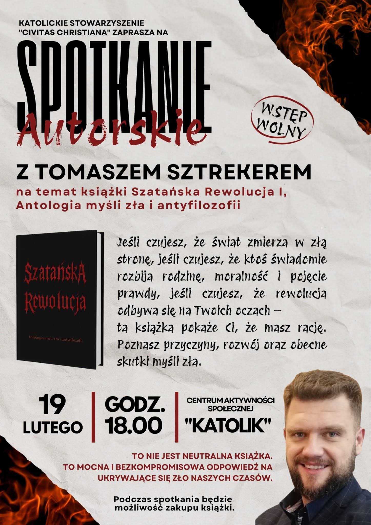Zapraszamy na spotkanie autorskie z Tomaszem Sztrekerem na temat książki "Szatańska Rewolucja I" Antologia myśli zła i antyfilozofii. Miejsce: Centrum Aktywności Społecznej "Katolik" Kościuszki 10, 87-500 Rypin 19 lutego o godzinie 18:00
