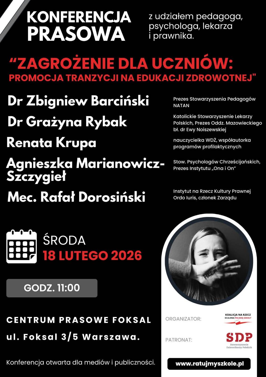Zapraszamy na konferencję prasową "Zagrożenie Dla Uczniów: Promocja tranzycji na lekcjach edukacji zdrowotnej". Z udziałem pedagoga, psychologa, lekarza i prawnika. 18.02.2026 Centrum Prasowe Foksal Godzina 11:00 ul. Foksal 3/5, Warszawa
